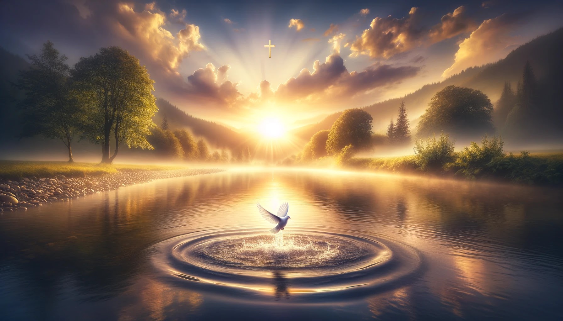 pomba, e a voz do Pai é ouvida, declarando Jesus como Seu Filho amado.